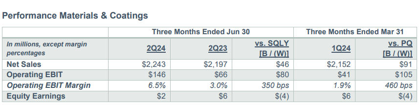 高性能材料和涂料部门,本季度净销售额为22亿美元,同比增长2%,销量同比增长7%;净销售额环比增长4%;营业息税前利润为1.46亿美元,与去年同期相比增加了8000万美元,环比增长1.05亿美元。